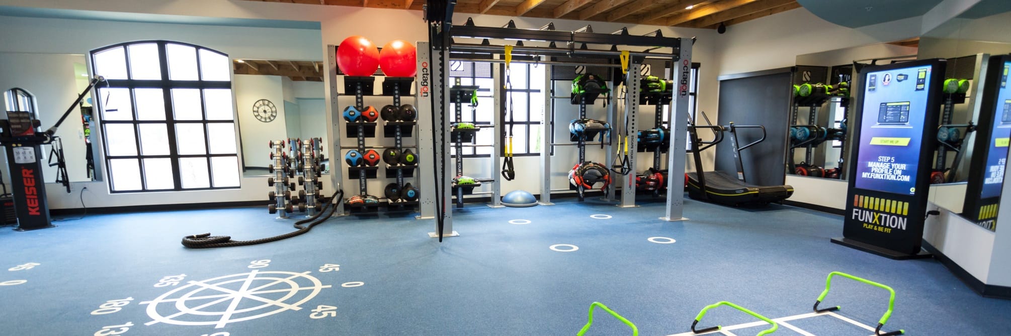 In complement to the Octagon is the Escape Fitness Funxtion interactive platform, a five-foot, cloud-based virtual trainer. Similar to a giant smart phone, the interactive touch screen device features a library of thousands of exercises utilizing various equipment in the gym — from sand bags to ropes, kettle bells and more — allowing members to create personalized, guided workouts without the aide of a personal trainer.